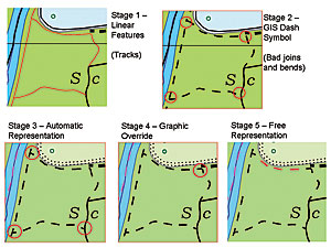 阶段三显示了新的制图表现功能如何在线的交叉点的位置,通过自动调整虚线,确保线的终点的连接。阶段四显示制图者如何强制断线的中心被放置在东北角的转弯处来表现线的走向。修改结果被作为覆盖保存在数据库的图形表现字段中