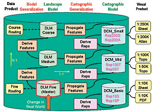 地形图和制图情况——在第三种情形下,一个组织已经有了实时维护的主数据库,希望生产制图和非制图的产品(如车载语音导航系统的导航路径图)。我们倾向于以主数据库作为数字地形模型(DLM)。对于制图产品,我们需要从DLM中通过选择获取必要的数据,并将它们组织成数据制图模型(DCM),该模型可以在多产品的情况下满足对多种制图表现的要求。(图10)