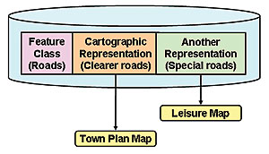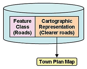 在物理存储上,制图表现在空间数据库中的标准ArcGIS要素类表上增加了两个额外的字段。原始的要素类用来存储点,线,面图形,和一组用于制图,分析和数据管理的属性字段。而制图表现字段被用来存储制图表现规则的相应信息。这些信息用来对要素进行符号化。他们还被用来存储制图覆盖,所谓覆盖,其实是指不同于表现规则的例外。