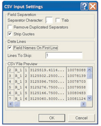 5. 点击Settings弹出CSV Input Settings对话框。因为CVS文件的第一行包含了字段名称,不是几何值,选中Field Names on First Line检查框。