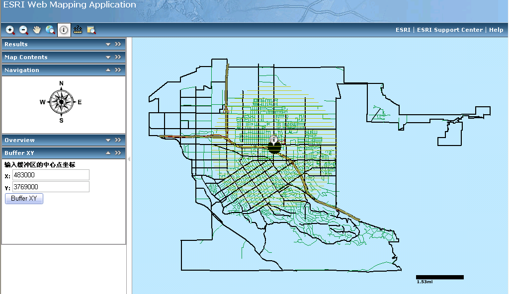 以上在ArcGIS Server中实现了缓冲区分析功能,虽然arcims也能实现(arcims分析功能也仅限于此),但是两者的本质有天然的差别,前者是基于AO,因此类推可以将AO中的分析功能全部引入server中,实现更多更复杂的分析功能。