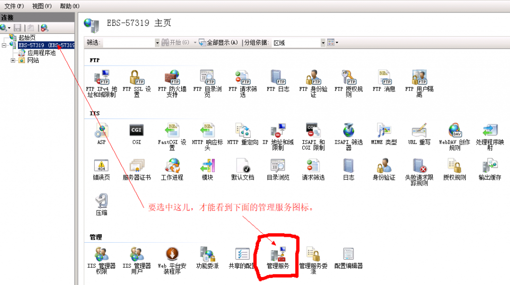 安装会等一会儿,安装好了后会在IIS的管理界面有一个管理服务的图标,如下图所示: