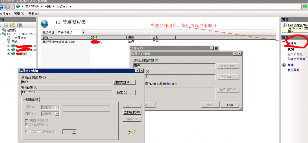 在上面这个步骤完成后,再返回到IIS里面,这时需要选中你的网站,再点击IIS管理权限,将你在上个步骤建的账号赋给这个网站,不然你咋远程发布.net core程序到这儿来呢?见下图姿势。