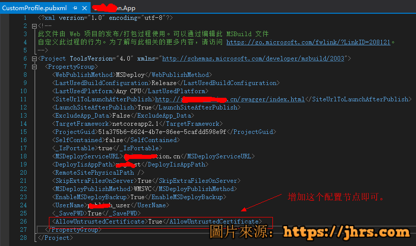 第二:打开CustomProfile.pubxml,在最后一个节点(_SavePWD)后增加一个节点,配置内容是: