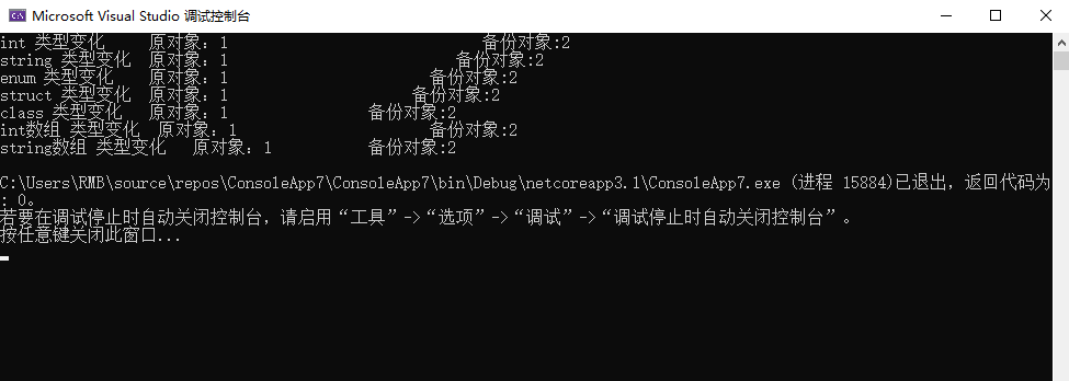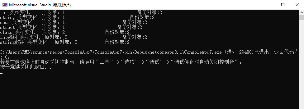 Console.WriteLine($"enum 类型变化 原对象:{(int)simple._enum}tt 备份对象:{(int)simpleTwo._enum}");