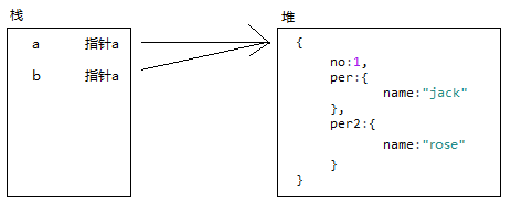 1 //在栈开辟一个空间a,存放a的指针地址,设指针地址为address2a,同时在堆开辟一个空间,设这空间为A,存放a对象数据 2 var a = { 3 no: 1, 4 per: { 5 name: "jack", 6 }, 7 per2: { 8 name: "rose" 9 }10 }11 12 //在栈开辟一个空间b,存放b的指针地址,设指针地址为address2b,同时在堆开辟一个空间,设这空间为B,存放b对象数据13 var b = {};14 15 //对a的数据进行循环,判断如果有key,就把值赋到B对应的key位置16 //这个循环,遇到数据类型为基本数据类型,赋的是值;遇到引用数据类型,赋的是指针地址17 for(var p in a) {18 if(a.hasOwnProperty(p)) {19 b[p] = a[p]20 }21 }22 23 //对b的第一层修改24 b.no = 1314;25 b.per2 = [];26 27 //对b的第二层修改28 b.per.name = "王五";29 30 //浅拷贝,修改b后,第一层修改都不影响原数据,第二层以及以上层次的修改都影响原数据31 //当前没有写第三层及以上层次,可自行测试。32 console.log(a, b)