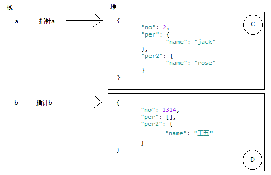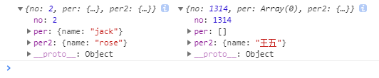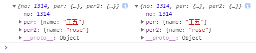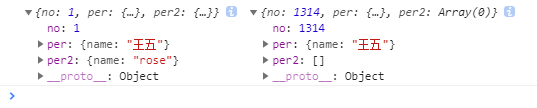 a = no: 1 name: "jack" name: "rose" b = b.no = 1314 b.per.name = "王五" console.log(a, b)
