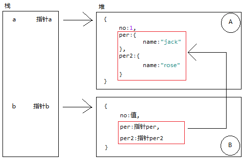上图所示中,B空间内的数据含有no的值,也就是1;a对象数据的per和per2都是属于引用对象数据,所以b保存的是它门的指针地址,分别指向了per和per2所在的地址位置。所以修改b对象数据的no的值不会影响a的no,修改per或per2的值就会影响a的per和per2。