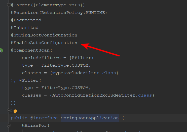 从启动类的@SpringBootApplication进入,在里面找到了@EnableAutoConfiguration: