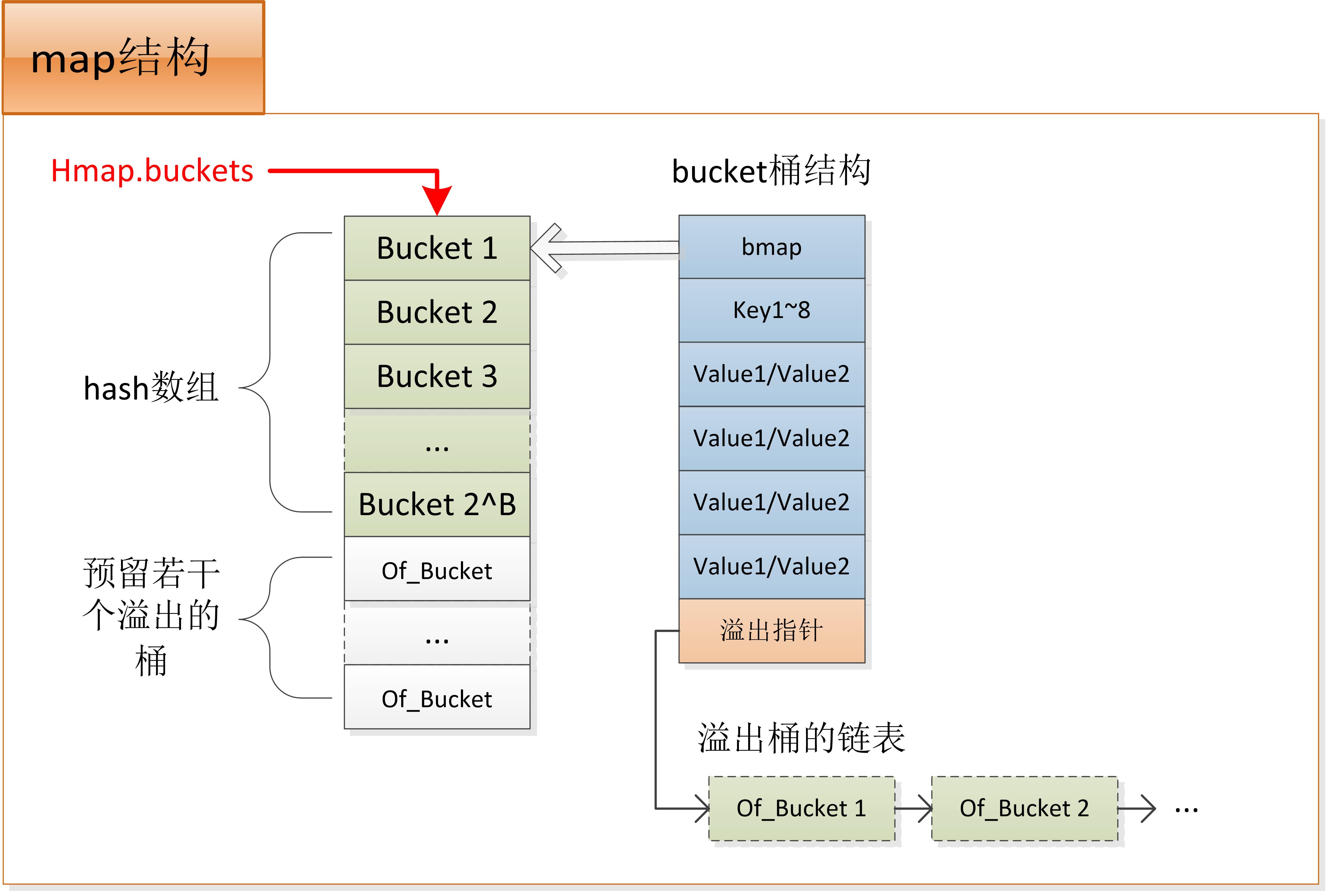 bmap:严格来说hmap.buckets指向桶组成的数组,每个桶的头部是bmap,之后是8个key,再是8个value,最后是1个溢出指针。溢出指针指向额外的桶链表,用于存储溢出的数据