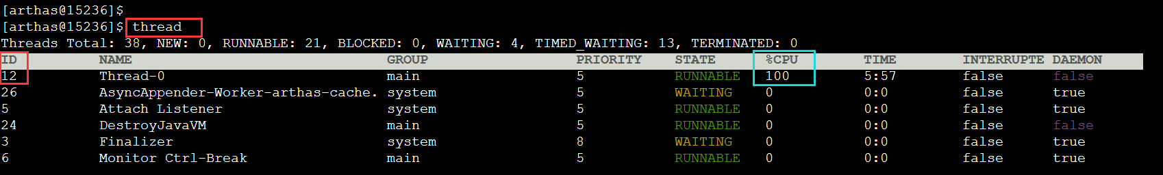 使用率,可以看到图里 ID 为12 的线程 CPU 使用100%。