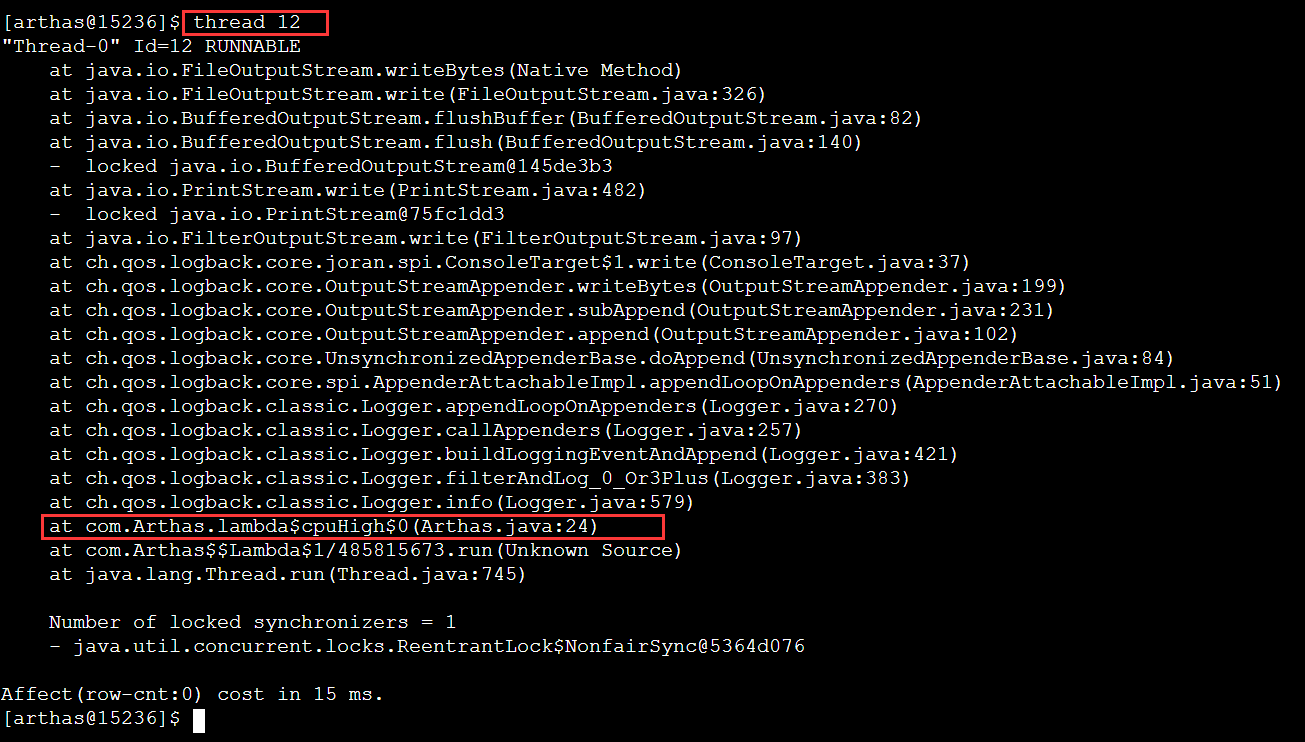 使用命令 thread 12 查看 CPU 消耗较高的 12 号线程信息,可以看到 CPU 使用较高的方法和行数(这里的行数可能和上面代码里的行数有区别,因为上面的代码在我写文章时候重新排过版了)。
