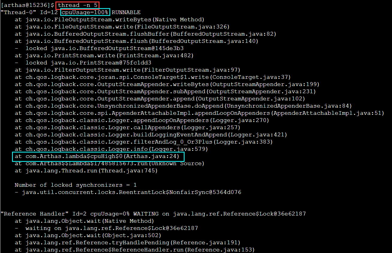 上面是先通过观察总体的线程信息,然后查看具体的线程运行情况。如果只是为了寻找 CPU 使用较高的线程,可以直接使用命令 thread -n [显示的线程个数] ,就可以排列出 CPU 使用率 Top N 的线程。