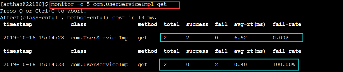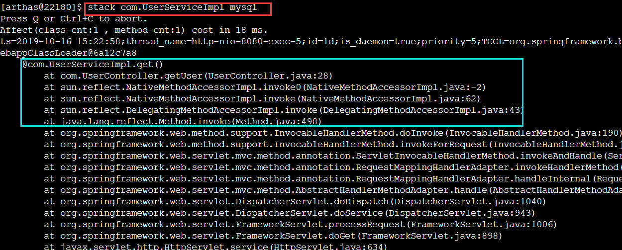 Affect(class-cnt:1 , method-cnt:1) cost in 31 ms. `---ts=2019-10-16 14:40:10;thread_name=http-nio-8080-exec-8;id=1f;is_daemon=true;priority=5;TCCL=org.springframework.boot.web.embedded.tomcat.TomcatEmbeddedWebappClassLoader@23a918c7 `---[6.792201ms] com.UserServiceImpl:get() +---[0.008ms] com.UserServiceImpl:check() #17 +---[0.076ms] com.UserServiceImpl:service() #18 +---[0.1089ms] com.UserServiceImpl:redis() #19 `---[6.528899ms] com.UserServiceImpl:mysql() #20