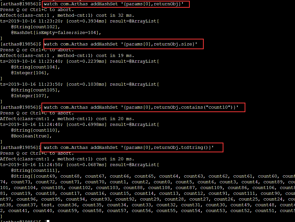 # 查看入参和出参 $ watch com.Arthas addHashSet '{params[0],returnObj}' # 查看入参和出参大小 $ watch com.Arthas addHashSet '{params[0],returnObj.size}' # 查看入参和出参中是否包含 'count10' $ watch com.Arthas addHashSet '{params[0],returnObj.contains("count10")}' # 查看入参和出参,出参 toString $ watch com.Arthas addHashSet '{params[0],returnObj.toString()}'