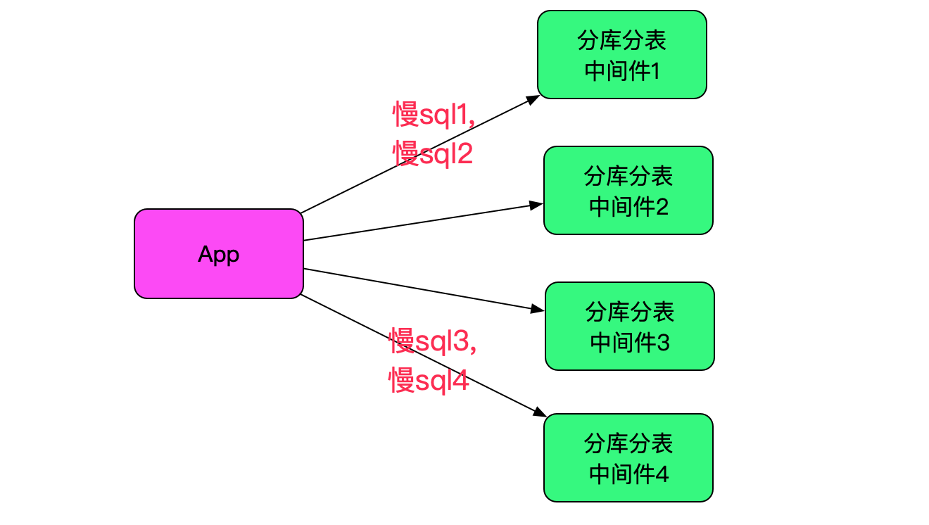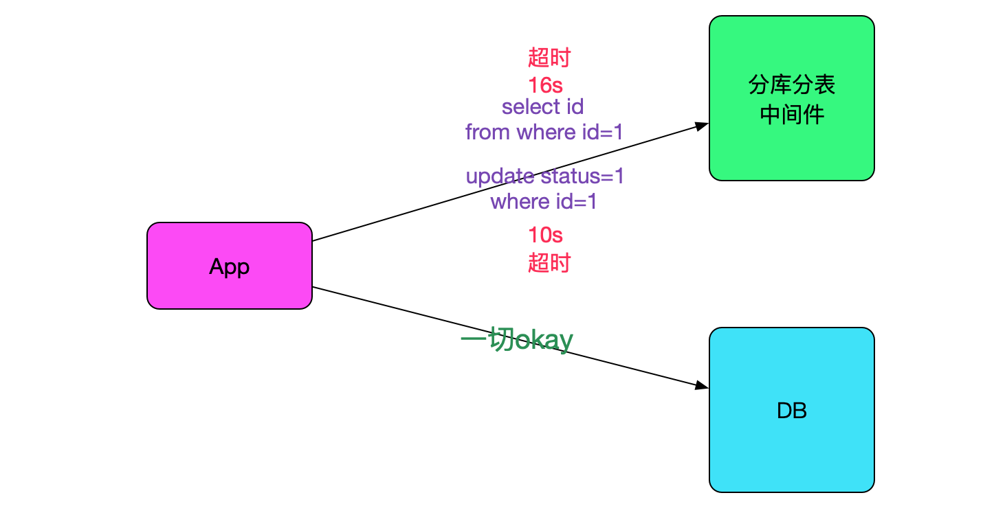 一个值得注意的点,就是此业务只有一部分流量走我们的中间件,另一部分还是直接走数据库的,而超时的sql只会在连中间件的时候出现,如下图所示: