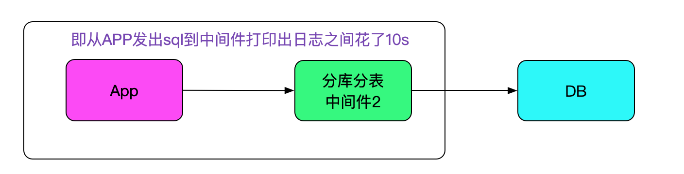 在上述发现的基础上,又经历了各种日志分析对应之后,终于找到了耗时sql日志和业务日志对应的关联。然后发现一个关键信息。中间件在接收到sql时候会打印一条日志,发现在应用发出sql到接收到sql还没来得及做后面的路由逻辑之前就差了10s左右,然后sql执行到返回确是非常快速的,如下图所示:
