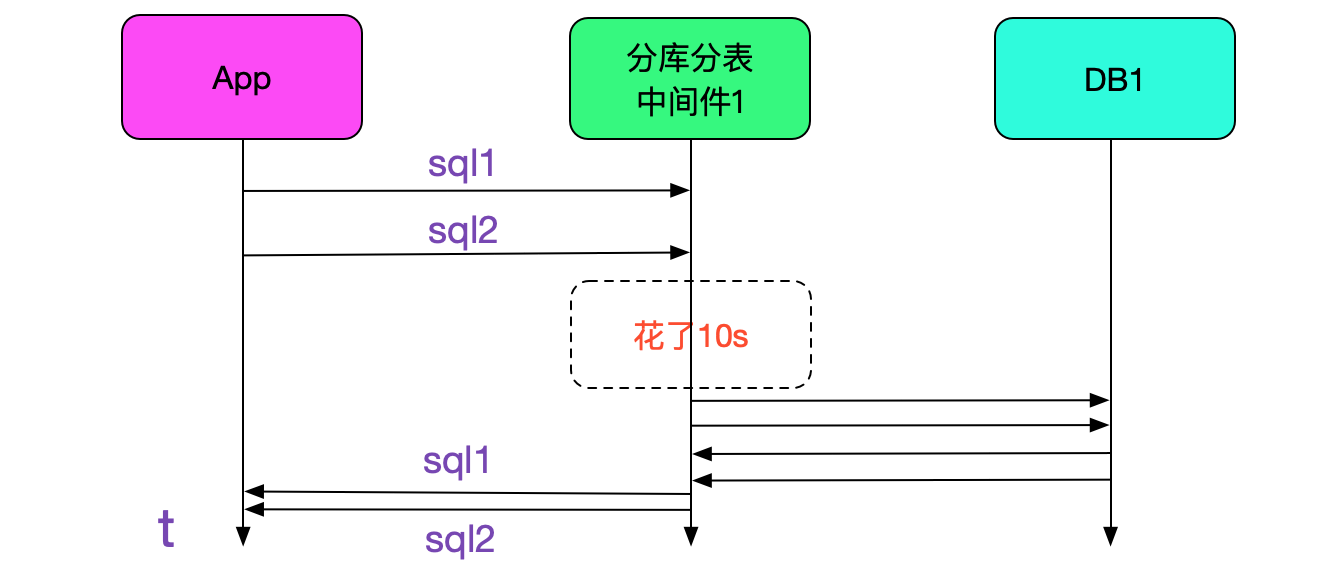 笔者联想到我们中间件有好多台,假设是中间件那边卡住的话,如果在那一瞬间,有两台sql同时落到同一台的话,中间件先卡住,然后在中间件恢复的那一瞬间,以0.5ms的速度执行完再返回就会导致这种现象。如下图所示: