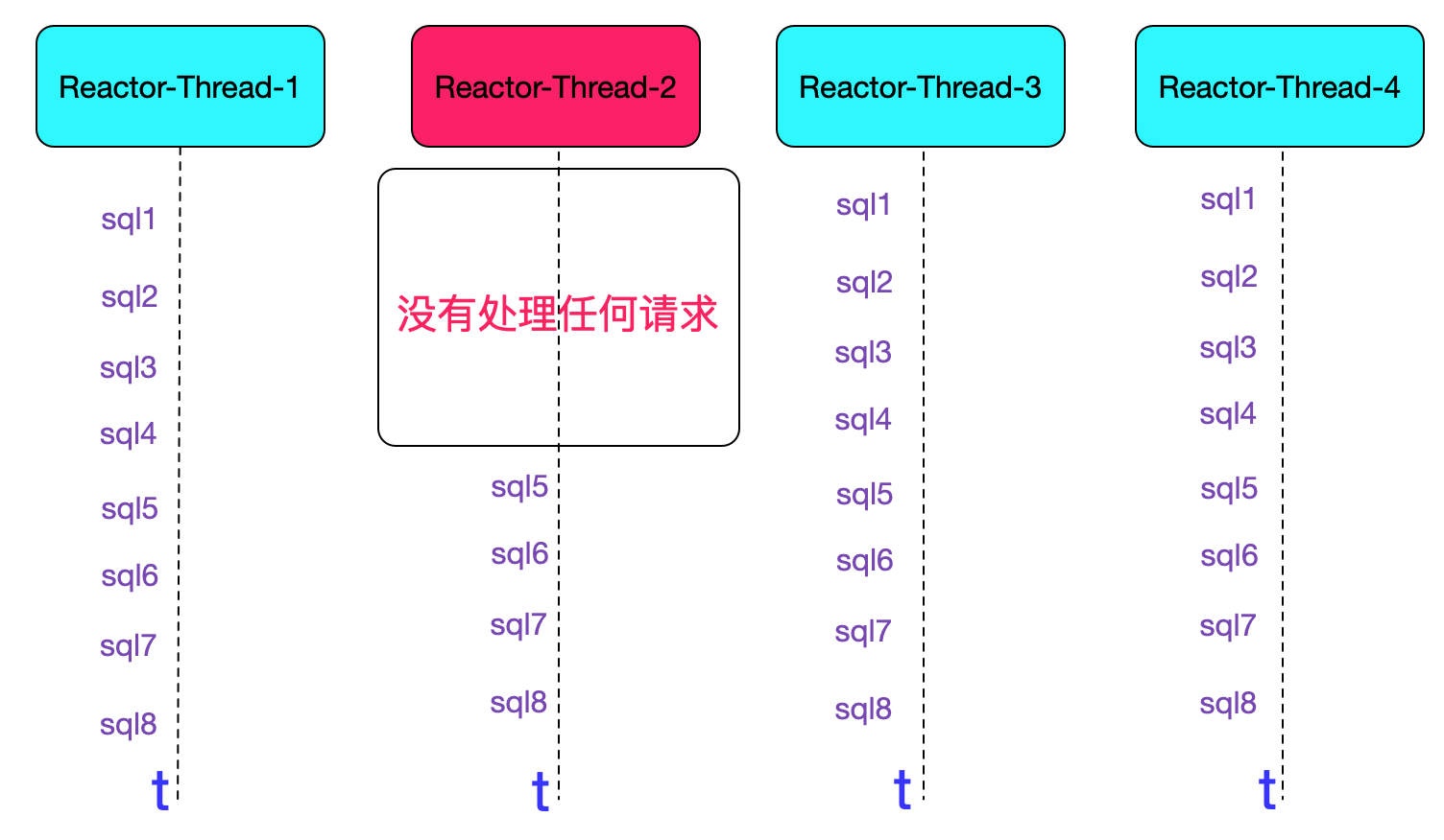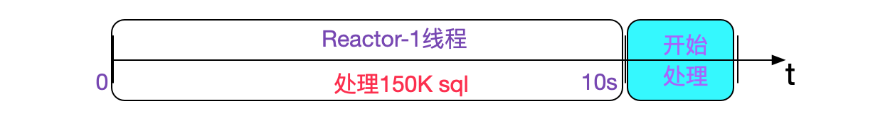 同时也发现两条sql都落在对应的Reactor-Thread-2的线程里面,再往前回溯,发现近10s内的线程都没有打印任何信息,好像什么都没处理。如下图所示: