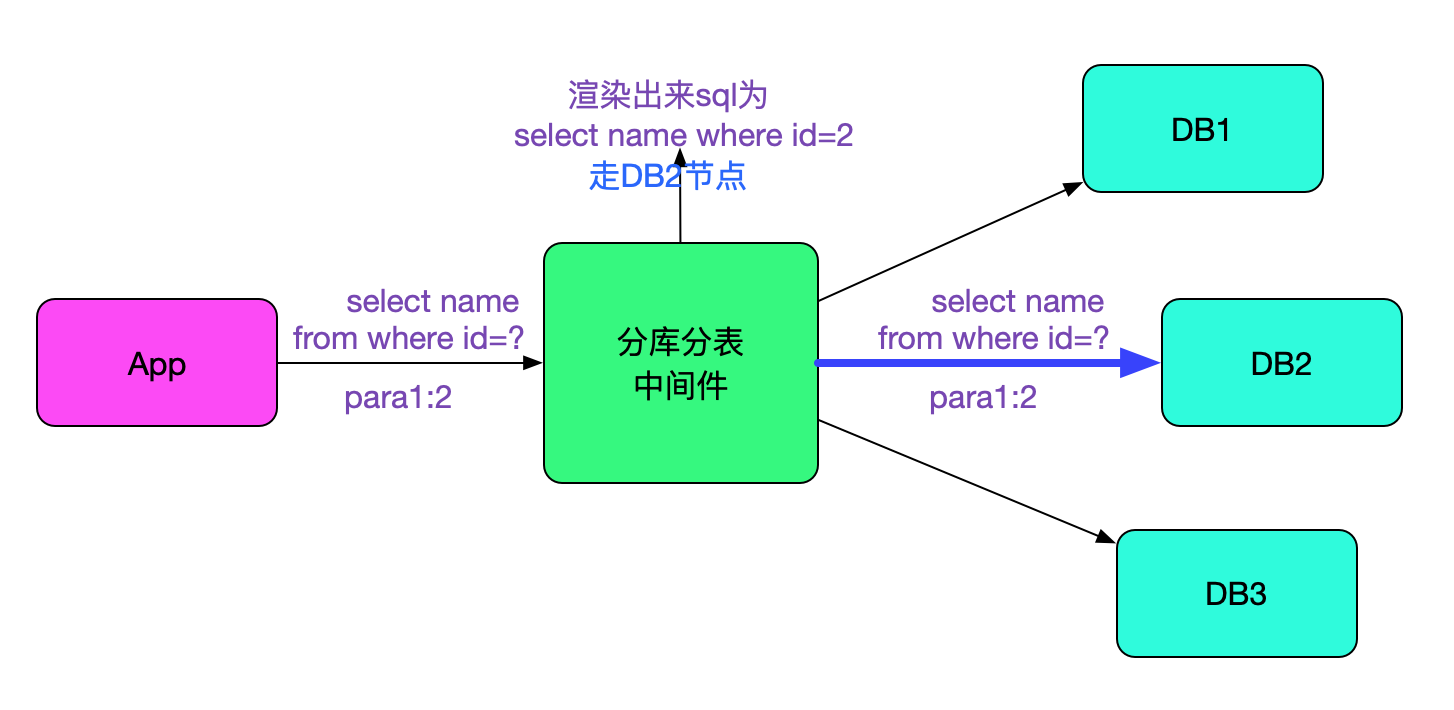 而在我们的中间件中,由于后端的数据库对使用prepareStatement的sql具有较大的性能提升,我们也支持了prepareStatement。而且为了能够复用原来的sql解析代码,我们会在接收到对应的sql和参数之后将其还原成不带?的sql算出路由到的数据库节点后,再将原始的带?的sql和参数prepare到对应的数据库,如下图所示:
