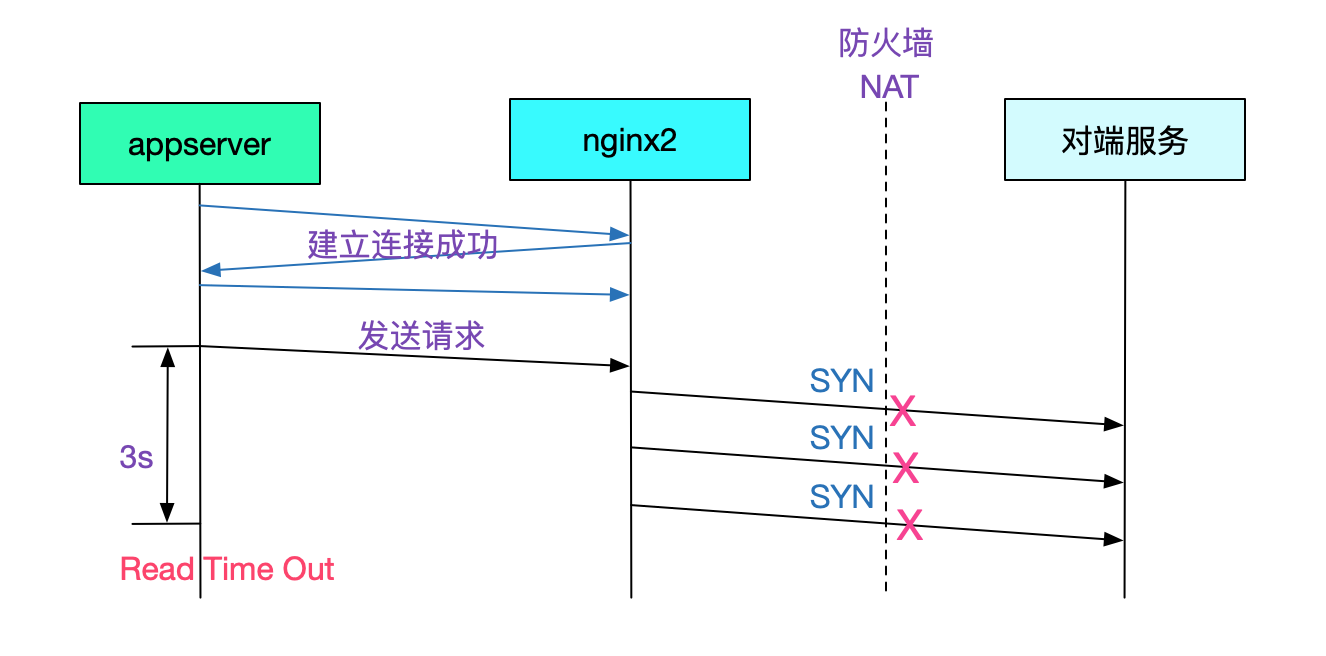 从抓包得出的数据来看,第二台nginx发送syn包给对端服务,对端服务没有任何响应,导致了nginx2创建连接超时,进而导致了appserver端的ReadTimeOut超时(appserver对nginx是短连接)。