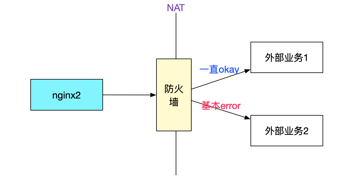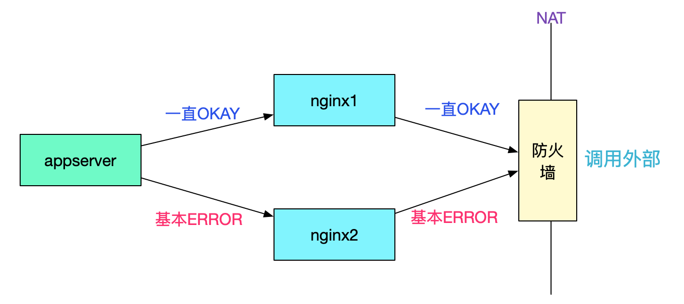 所有的appserver都是调用一台nginx一直成功,而调用另一台nginx大概率失败。而两台nginx机器的配置一模一样,还有一个奇怪的点是,只有在调用出问题的对端服务器时才会失败,其它业务没有任何影响,如下图所示: