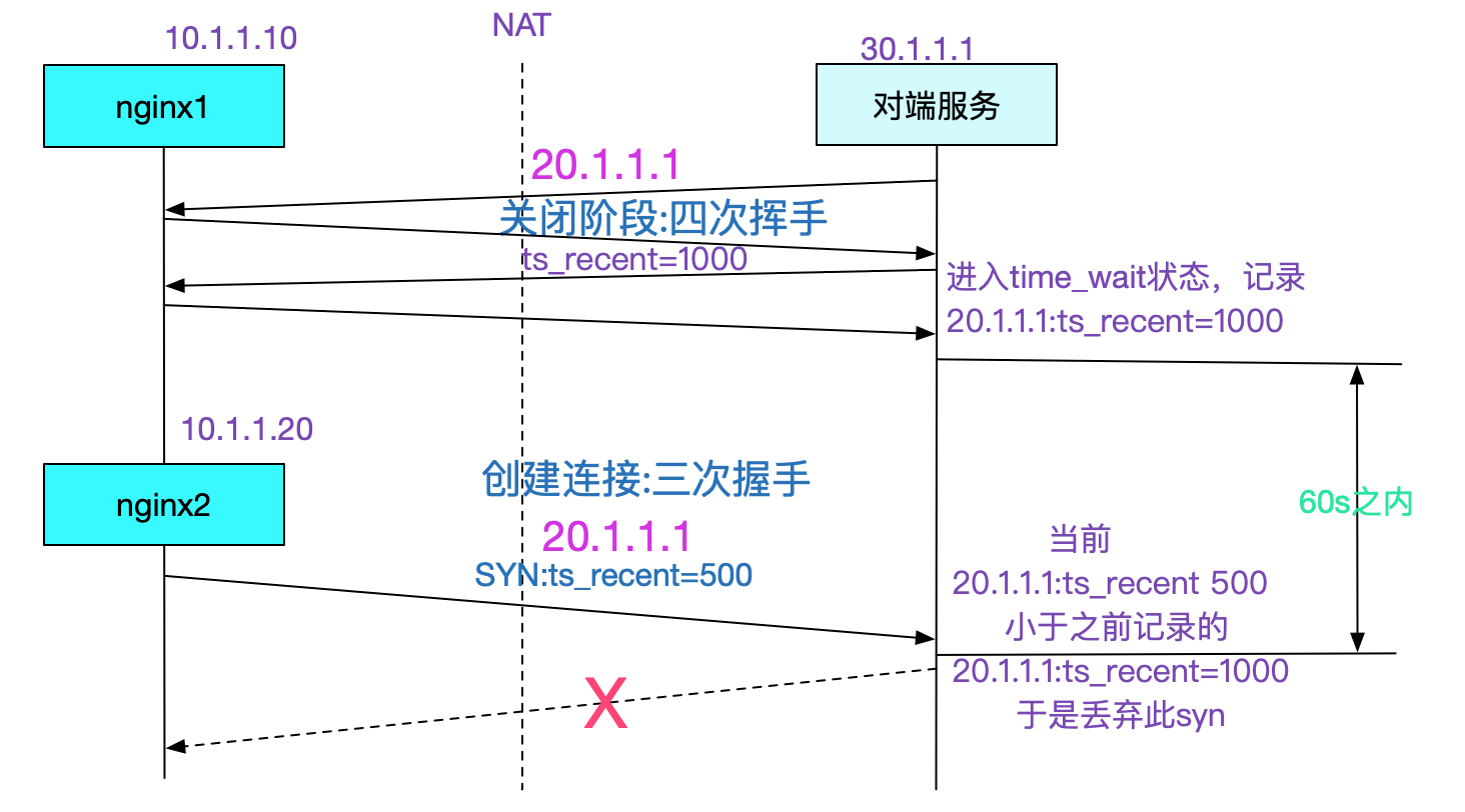 由于tcp的时间戳是指的并不是当前本机用date命令给出的时间戳。这个时间戳的计算规则就在这里不展开了,只需要知道每台机器的时间戳都不相同即可(而且相差可能极大)。由于我们调用对端采用的是NAT,所以两台nginx在对端服务器看来是同一个ip,那么这两台的时间戳发送到对端服务器的时候就会混乱。nginx1的时间戳比nginx2的时间戳大,所以在一分钟之内,只要出现nginx1的连接请求(短连接),那么之后的nginx2的连接请求就会一直被丢弃。如下图所示: