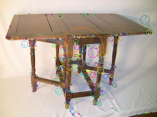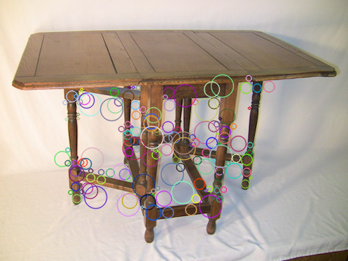 import cv2 as cv original = cv.imread('../machine_learning_date/table.jpg') gray = cv.cvtColor(original, cv.COLOR_BGR2GRAY) # 变成灰度图,减少计算cv.imshow('Gray', gray) star = cv.xfeatures2d.StarDetector_create() # 创建STAR特征点检测器keypoints = star.detect(gray) # 检测出gray图像所有的特征点mixture = original.copy()# drawKeypoints方法可以把所有的特征点绘制在mixture图像中cv.drawKeypoints(original, keypoints, mixture, flags=cv.DRAW_MATCHES_FLAGS_DRAW_RICH_KEYPOINTS) cv.imshow('Mixture', mixture) cv.waitKey()