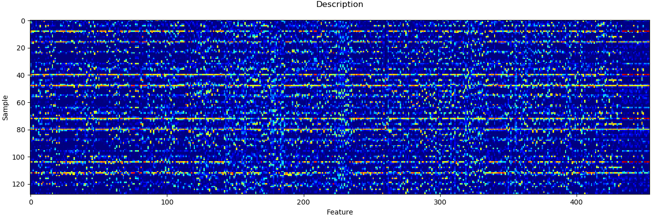 import cv2 as cvimport matplotlib.pyplot as plt original = cv.imread('../machine_learning_date/table.jpg') gray = cv.cvtColor(original, cv.COLOR_BGR2GRAY) cv.imshow('Gray', gray) sift = cv.xfeatures2d.SIFT_create() # 创建SIFT特征点检测器keypoints = sift.detect(gray) # 检测出gray图像所有的特征点_, desc = sift.compute(gray, keypoints)print(desc.shape) # (454, 128)plt.matshow(desc.T, cmap='jet', fignum='Description') plt.title('Description') plt.xlabel('Feature') plt.ylabel('Sample') plt.tick_params(which='both', top=False, labeltop=False, labelbottom=True, labelsize=10) plt.show()