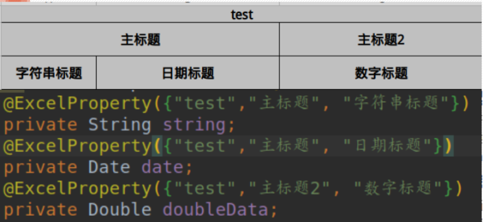 在POI中我们实现合并单元格我们需要指定合并的范围。但是在easyexcel中我们只需要在ExcelProperty注解中加入表头的时候在对应位置加入相同的内容就会自动的合并单元格。