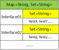 ignoreMap的数据结构类似于setterMap,但第二层不是HashMap,而是Set,缓存每个子类需要忽略的键值对的名字,使用Set更节约系统资源,如下图所示:
