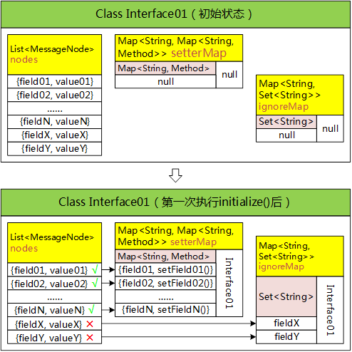 初始状态下,setterMap检索不到Interface01类的setter缓存,initialize()函数会在第一次执行的时候,根据键值对的名字(field01/field02/……/fieldN/fieldX/fieldY)调用getMethod()函数、初始化sertter引用的缓存。因为fieldX和fieldY字段不存在,找不到它们对应的setter,缓存里也没有它们的引用。