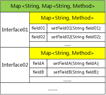 setterMap就是缓存字段setter的HashMap。为什么是两层嵌套结构呢?因为这个Map是写在基类里面的静态变量,每个从基类派生出的接口类都用它缓存setter,所以第一层要区分不同的接口类,第二层要区分不同的字段。如下图所示: