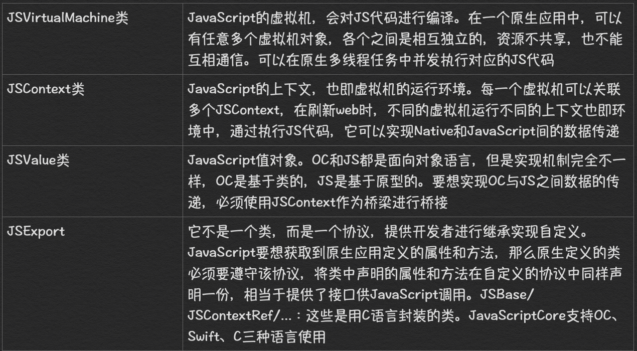 //js上下文@property (readonly, strong) JSContext *context;//使用OC数据初始化js值对象,创建有值的JSValue+ (JSValue *)valueWithObject:(id)value inContext:(JSContext *)context;+ (JSValue *)valueWithBool:(BOOL)value inContext:(JSContext *)context;+ (JSValue *)valueWithDouble:(double)value inContext:(JSContext *)context;+ (JSValue *)valueWithInt32:(int32_t)value inContext:(JSContext *)context;+ (JSValue *)valueWithUInt32:(uint32_t)value inContext:(JSContext *)context;+ (JSValue *)valueWithPoint:(CGPoint)point inContext:(JSContext *)context;+ (JSValue *)valueWithRange:(NSRange)range inContext:(JSContext *)context;+ (JSValue *)valueWithRect:(CGRect)rect inContext:(JSContext *)context;+ (JSValue *)valueWithSize:(CGSize)size inContext:(JSContext *)context;//使用OC数据初始化js值对象,创建空的JSValue+ (JSValue *)valueWithNewObjectInContext:(JSContext *)context;+ (JSValue *)valueWithNewArrayInContext:(JSContext *)context;+ (JSValue *)valueWithNewRegularExpressionFromPattern:(NSString *)pattern flags:(NSString *)flags inContext:(JSContext *)context;+ (JSValue *)valueWithNewErrorFromMessage:(NSString *)message inContext:(JSContext *)context;+ (JSValue *)valueWithNewPromiseInContext:(JSContext *)context fromExecutor:(void (^)(JSValue *resolve, JSValue *reject))callback;+ (JSValue *)valueWithNewPromiseResolvedWithResult:(id)result inContext:(JSContext *)context;+ (JSValue *)valueWithNewPromiseRejectedWithReason:(id)reason inContext:(JSContext *)context;+ (JSValue *)valueWithNewSymbolFromDescription:(NSString *)description inContext:(JSContext *)context;+ (JSValue *)valueWithNullInContext:(JSContext *)context;+ (JSValue *)valueWithUndefinedInContext:(JSContext *)context;//js数据转OC数据- (id)toObject;- (id)toObjectOfClass:(Class)expectedClass;- (BOOL)toBool;- (double)toDouble;- (int32_t)toInt32;- (uint32_t)toUInt32;- (NSNumber *)toNumber;- (NSString *)toString;- (NSDate *)toDate;- (NSArray *)toArray;- (NSDictionary *)toDictionary;- (CGPoint)toPoint;- (NSRange)toRange;- (CGRect)toRect;- (CGSize)toSize;//js值对象判断@property (readonly) BOOL isUndefined; @property (readonly) BOOL isNull; @property (readonly) BOOL isBoolean; @property (readonly) BOOL isNumber; @property (readonly) BOOL isString; @property (readonly) BOOL isObject; @property (readonly) BOOL isArray; @property (readonly) BOOL isDate; @property (readonly) BOOL isSymbol;- (BOOL)isEqualToObject:(id)value;- (BOOL)isEqualWithTypeCoercionToObject:(id)value;- (BOOL)isInstanceOf:(id)value;//js调用函数- (JSValue *)callWithArguments:(NSArray *)arguments;- (JSValue *)constructWithArguments:(NSArray *)arguments;- (JSValue *)invokeMethod:(NSString *)method withArguments:(NSArray *)arguments;//js属性设置- (JSValue *)valueForProperty:(JSValueProperty)property;- (void)setValue:(id)value forProperty:(JSValueProperty)property;- (BOOL)deleteProperty:(JSValueProperty)property;- (BOOL)hasProperty:(JSValueProperty)property;- (void)defineProperty:(JSValueProperty)property descriptor:(id)descriptor;- (JSValue *)valueAtIndex:(NSUInteger)index;- (void)setValue:(id)value atIndex:(NSUInteger)index;- (JSValue *)objectForKeyedSubscript:(id)key;- (JSValue *)objectAtIndexedSubscript:(NSUInteger)index;- (void)setObject:(id)object forKeyedSubscript:(id)key;- (void)setObject:(id)object atIndexedSubscript:(NSUInteger)index;+ (JSValue *)valueWithJSValueRef:(JSValueRef)value inContext:(JSContext *)context;//OC与JS类型对应关系 Objective-C type | JavaScript type ---------------------+--------------------- nil | undefined NSNull | null NSString | string NSNumber | number, boolean NSDictionary | Object object NSArray | Array object NSDate | Date object NSBlock (1) | Function object (1) id (2) | Wrapper object (2) Class (3) | Constructor object (3) ---------------------+---------------------