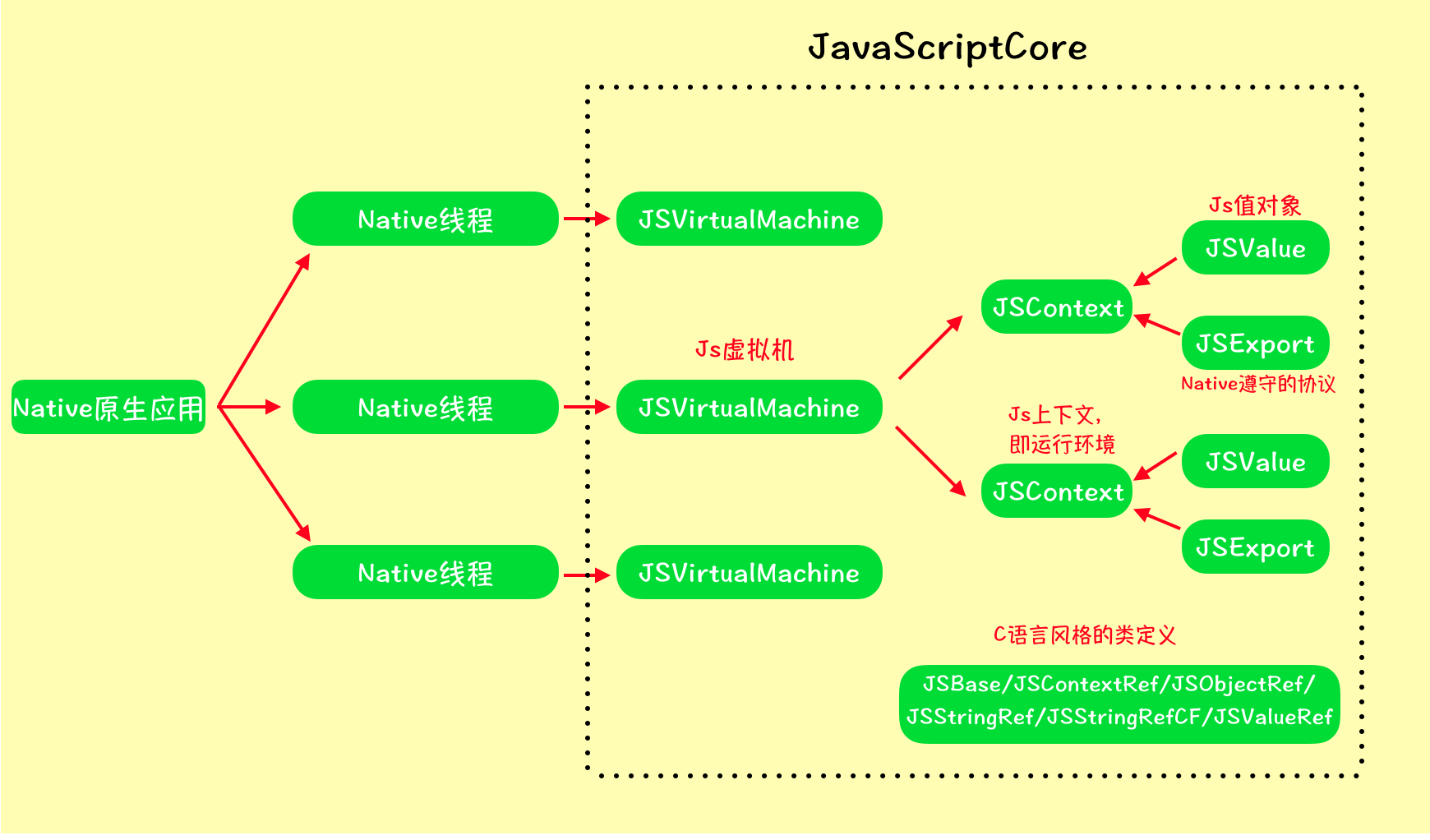 Hybrid Development混合开发是目前移动端开发异常火热的新兴技术,它能够实现跨平台开发,极大地节约了人力和资源成本。跨平台开发催生了很多新的开源框架,就目前而言,在混合开发中比较流行的有FaceBook开源React Native,有Goggle开源的Flutter。React Native实现的是通过下发JS脚本的方式达到JS与Native交互。Flutter实现的则是通过采用现代响应式框架来构建UI,Flutter与ReactiveCocoa框架配合使用最佳。当然开发者也可以在Native中内嵌WebView的方式(WebKit)实现混合开发。虽然方式不同,但目的相同,都是跨平台,殊途同归吧。对跨平台有了粗略的了解后,再来看看iOS系统中对JS与Native是如何交互的,其实,系统是给开发者提供了一个极其强大的框架来实现这个功能的,即JavaScriptCore框架。这个框架通过定义JSValue值对象和声明JSExport协议作为桥梁完成Native与JS的通信。JS虽然是单线程语言,但是iOS是支持多线程执行任务的,开发者可以在异步情况下执行任意一个环境的JavaScript代码。大概结构图如下:
