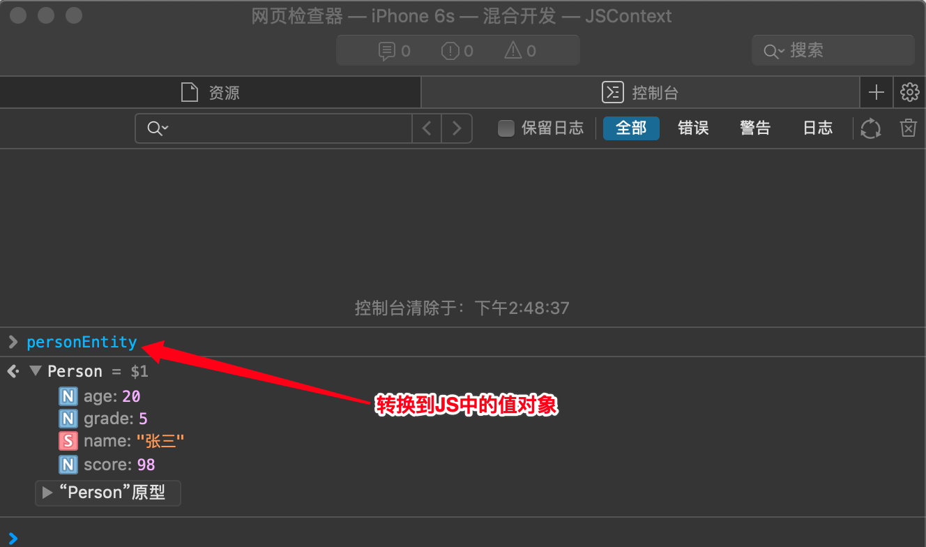 //特殊的OC类型,自定义对象,则必须遵守JSExport协议,JS才能拿到自定义对象的所有属性和方法Person *person = [[Person alloc] init]; person.name = @"张三"; person.age = 20; person.grade = 5; person.score = 98; [self.jsContext setObject:person forKeyedSubscript:@"personEntity"]; JSValue *personValue = [self.jsContext objectForKeyedSubscript:@"personEntity"]; //personEntity为OC在JS的对象形式Person *xyq_person = (Person *)[personValue toObject]; [xyq_person description];