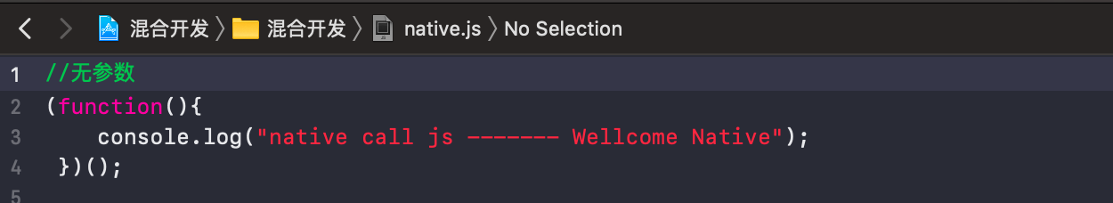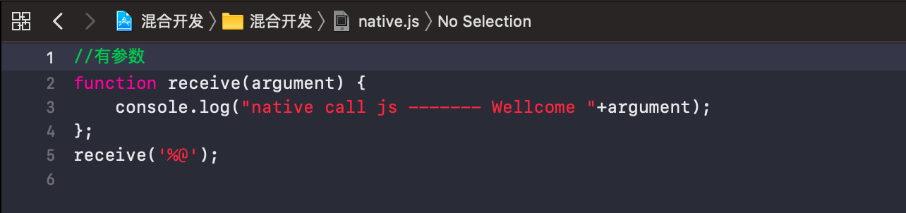 -(void)nativeCallJsWithArguments:(NSString *)argument { //方式一//从js文件获取js代码NSString *path = [[NSBundle mainBundle] pathForResource:@"native" ofType:@"js"]; NSData *jsData = [NSData dataWithContentsOfFile:path]; NSString *jsString = [[NSString alloc] initWithData:jsData encoding:NSUTF8StringEncoding]; //拼接js参数NSString *script = [NSString stringWithFormat:jsString,argument]; //执行js代码 [self.jsContext evaluateScript:script]; }