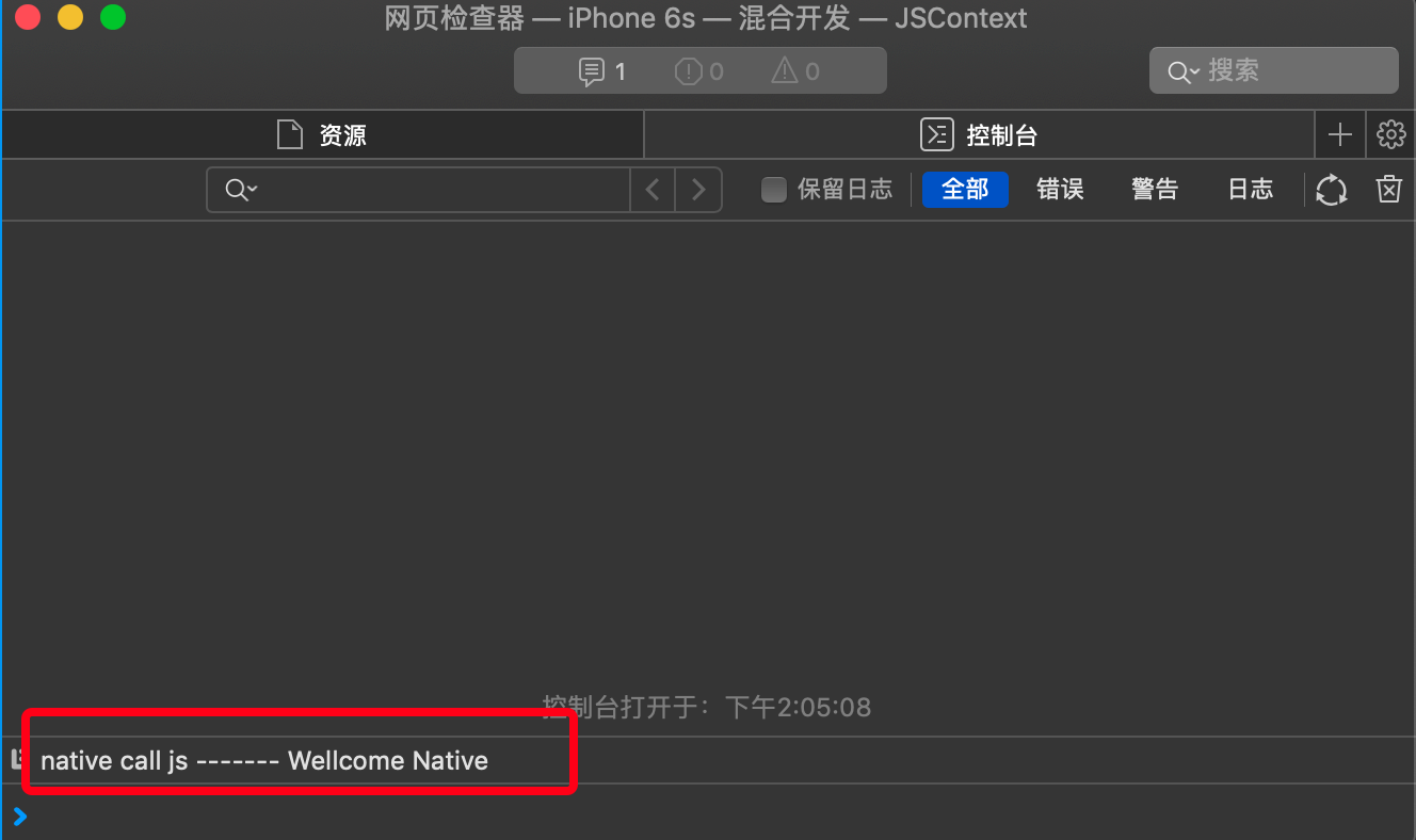 -(void)nativeCallJs { //方式二//js代码写在端上NSString *script = @" (function(){ console.log("native call js ------- Wellcome Native");})();"; //执行js代码 [self.jsContext evaluateScript:script]; }