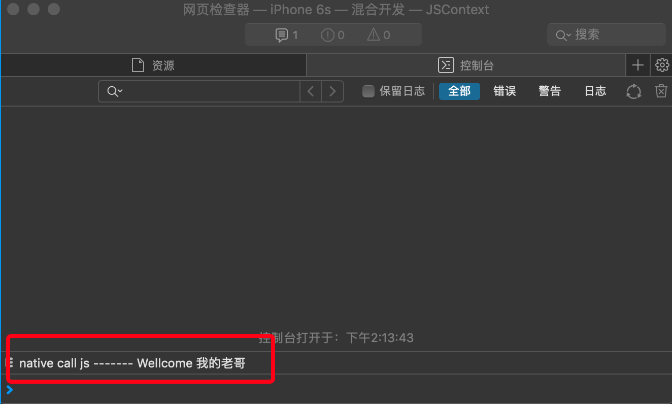 -(void)jsCallNative { //定义无参数blockvoid (^Block1)(void) = ^(){ NSLog(@"js call native ------- hello JavaScript"); }; //定义有参数blockvoid (^Block2)(NSString *) = ^(NSString *argument){ NSLog(@"js call native ------- hello JavaScript----Wellcome %@",argument); }; //设置block为JSContext全局对象的属性,然后可以在safari控制台执行函数oc_block()输出打印;[self.jsContext setObject:Block1 forKeyedSubscript:@"oc_block1"]; [self.jsContext setObject:Block2 forKeyedSubscript:@"oc_block2"]; }