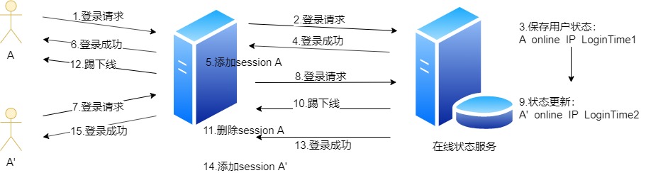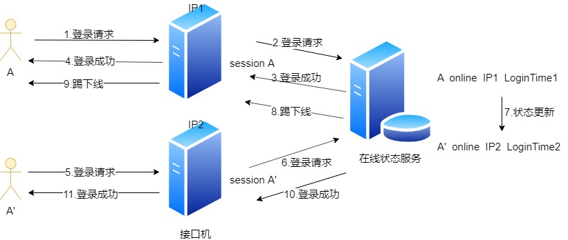用户登录的时候,接口机首先查找本机上是否有session,如果有则更新session,接着给在线状态服务发送登录包,在线状态服务检查用户是否已经在线,如果在线则更新状态信息,并向上次登录的接口机IP发送踢下线包;接口机在收到踢下线包时会检查包中的用户ID是否存在session,如果存在则给客户端发送踢下线包并删除session。