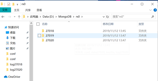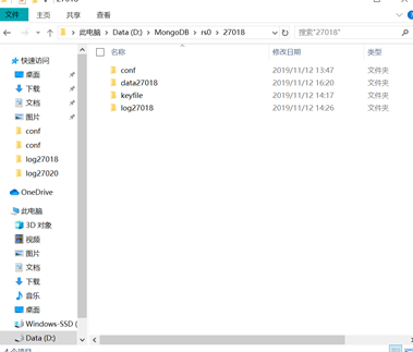 每一份的目录结构如下,conf存放的是配置文件信息,data27018是存放数据库数据信息,keyfile是存放key文件的。用于各个节点之间的身份验证。log存放数据库的日志信息,用来排查问题。