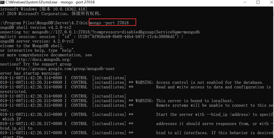 8.重新打开cmd 连接到其中的一个mongodb实例命令为: mongo --host ip地址 --port 27018
