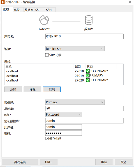 添加主机名,端口号,点击发现,可以查询当前复制集中的端口服务。