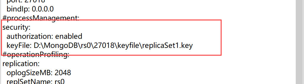 Conf是放配置文件 # mongod.conf # for documentation of all options, see: # http://docs.mongodb.org/manual/reference/configuration-options/# Where and how to store data. storage: dbPath: D:MongoDBrs027018data27018 journal: enabled: true# engine: # mmapv1: # wiredTiger: # where to write logging data. systemLog: destination: file logAppend: true path: D:MongoDBrs027018log27018mongo.log # network interfaces net: port: 27018 bindIp: 0.0.0.0#processManagement: security: authorization: enabled keyFile: D:MongoDBrs027018keyfilereplicaSet1.key #operationProfiling: replication: oplogSizeMB: 2048 replSetName: rs0 #sharding: #clusterRole: shardsvr ## Enterprise-Only Options: #auditLog: #snmp: