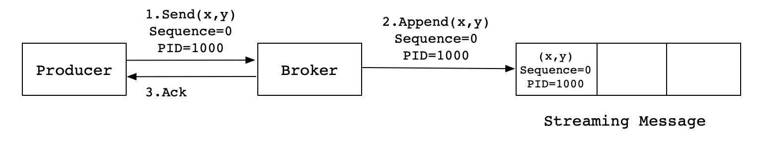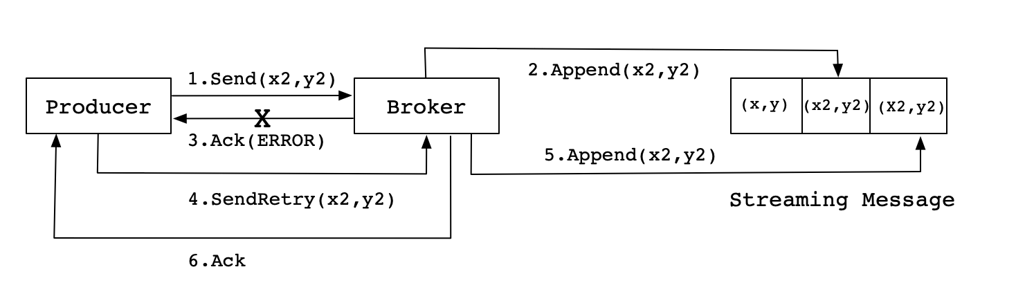 上图这种情况,当Producer第一次发送消息给Broker时,Broker将消息(x2,y2)追加到了消息流中,但是在返回Ack信号给Producer时失败了(比如网络异常) 。此时,Producer端触发重试机制,将消息(x2,y2)重新发送给Broker,Broker接收到消息后,再次将该消息追加到消息流中,然后成功返回Ack信号给Producer。这样下来,消息流中就被重复追加了两条相同的(x2,y2)的消息。