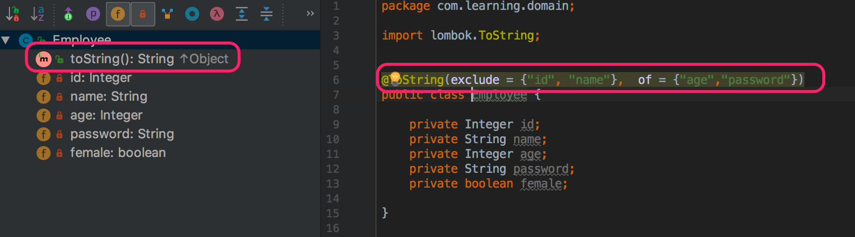 属性禁止在 toString 方法中使用某字段,而of属性可以指定需要使用的字段,如下图: