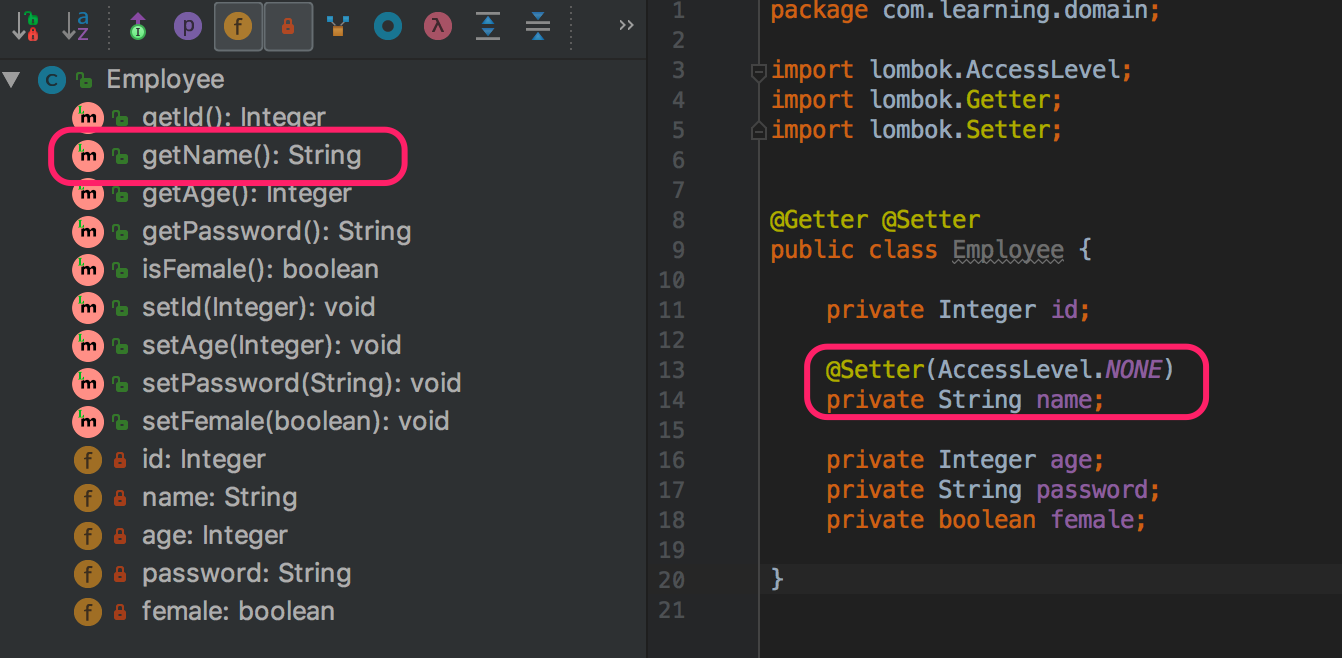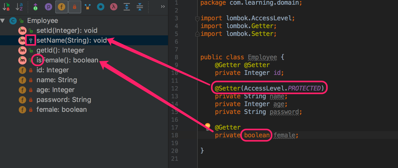 成员变量name指定生成set方法,并且访问权限为protected;boolean类型的成员变量 female 只生成get方法,并修改方法名称为 isFemale()。当把该注解应用在类上,默认为所有非静态成员变量生成 get 和 set 方法,也可以通过 AccessLevel.NONE 手动禁止生成get或set方法,如下图: