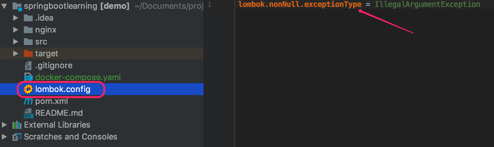 当然我们可以通过指定异常类型抛出其他异常,lombok.nonNull.exceptionType = [NullPointerException | IllegalArgumentException] , 为实现此功能我们需要在项目的根目录新建lombok.config文件: