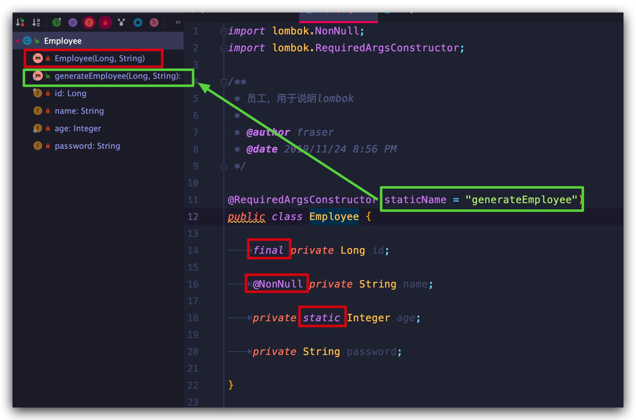 注解生成有参数构造器时只会包含有 final 和 @NonNull
