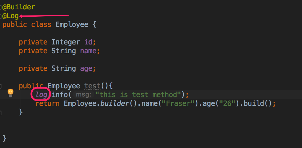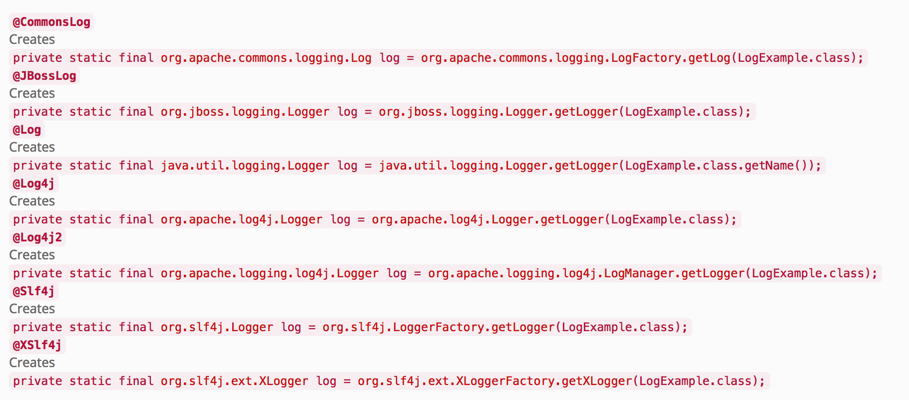 Log有很多变种,CommonLog,Log4j,Log4j2,Slf4j等,lombok依旧良好的通过变种注解做良好的支持:
